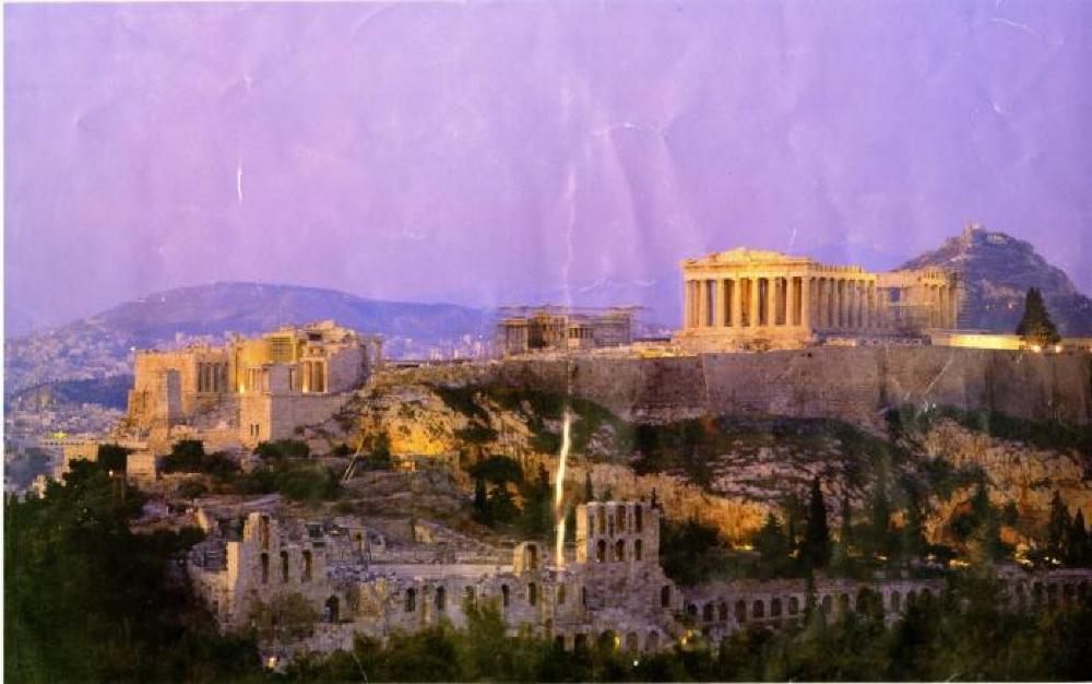 Color print of Athens. The sky is a purple color, and the Parthenon is up above the city. What looks like ruins can be seen in the foreground of the print, with the city in the back left corner. There is also a mountain in the right corner with a building on top of it. Trees can be found by the ruins in the foreground.