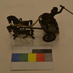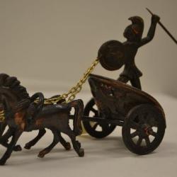 A warrior/soldier clad in skirt and helmet, wielding a shield and spear on a chariot (with two wheels that function) driving two horses (mid-trot) attached to the warrior's shield by a golden chain. The warrior poses with his front leg bent and with his arm raised. This object is a souvenir.
