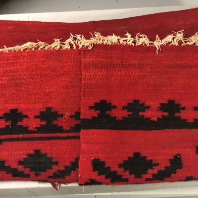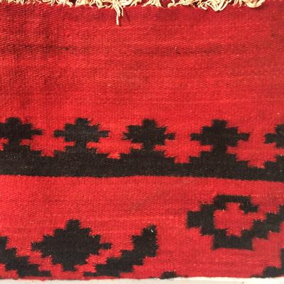 Red, black area rug, geometric design at both ends, hand dyed.