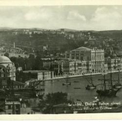 The front shows a scene on the Bosphorus of boats in the straight and the Dolma Bache Palace on the riverbank. There is a mosque in the foreground to the left and another at the bottom right corner where you can see a minaret. The bottom of the card reads 'Istanbul Dolma Bahce civari. Dolma Bahtche et Evrions'. On the back is a message written in Greek. The back has four lines on the left side for the address, it is a bit less structured than most postcards look.