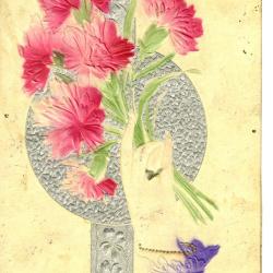 The front depicts a hand holding pink flowers. The woman is wearing a ring, a bracelet, and a shirt with a purple sleeve. Behind the woman and flowers is a stripe of silver and a circle in the middle. On the back is a message written in Greek. Unlike the others in this collection, there are no postcard lines.