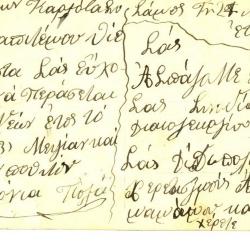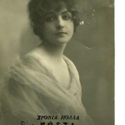 The front is a portrait of a woman looking forward and wearing a tule dress or shawl. At the bottom is written "Xronia Polla Kosta" which translates to Happy Birthday Kosta. On the back is a message written in Greek.