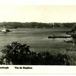 The front is a scene on the Bosphorus with a few houses on the water to the right and a building on a small island on the left. There are a few boats in the background on the water. There is a white border around the photo and on the bottom is written "260 Constantinople Vue du Bosphore." On the back is a message written on the diagonal written in Greek.