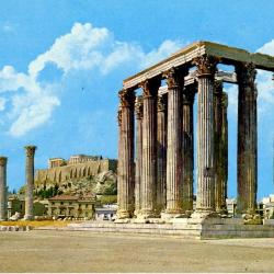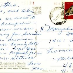 The front is a view of the Temple of Olympian Zeus with the Acropolis in the background. The back has a message written in English that says "Dear Thea, Theo, and Helene, Today we went to the Acropolis - tomorrow we are leaving for Salonika --- we are having lots of fun- hope you're well-regards from all our relatives- love Jean." Sent to Michigan.