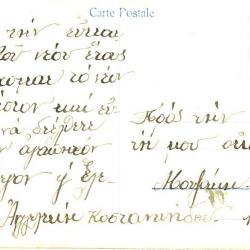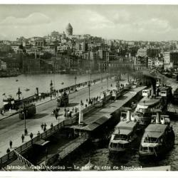 The front is a scene of the Galata Bridge in Istanbul. There are many ships docked and people walking along the boardwalk. Two street cars are going down the center of the boardwalk. In the background are many buildings including the Galata Tower, which sticks out for being the tallest. At the bottom of the card reads 'Istanbul, Galata koprusu- Le pont du cote de Stamboul'. The back has a message written in Greek.