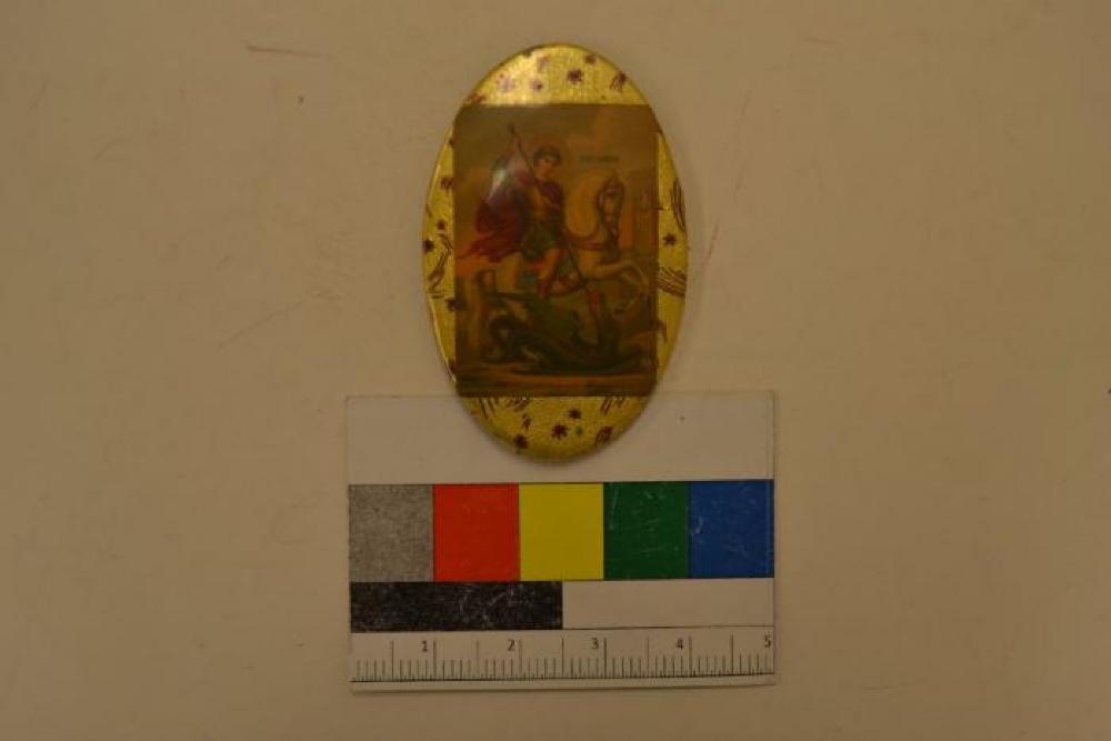 Small oval icon featuring a square image of Saint George on his horse slaying a dragon mounted on a gold background with purple embellishments and is sealed/protected with plastic. The icon's underside is blue with a small looped string for mounting.