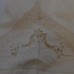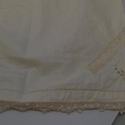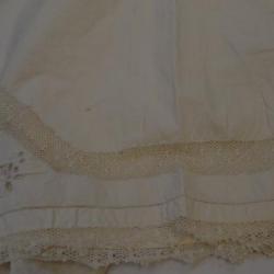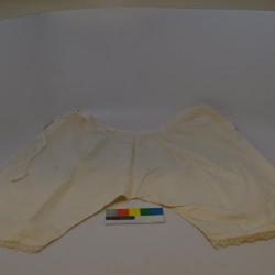 Cream pantaloons with ties at each hip. Crocheted and cut work designs at edge and outer/back knee. The crocheted bottom has a scalloped edge and a design of squares. The outer edge has a cutwork design with three flowers on it that are connected by leaves. The crocheted cutwork starts at the front, then comes to a point above the flowers and descends before levelling off about two inches above the bottom. It has the same design that is on the crocheted bottom.