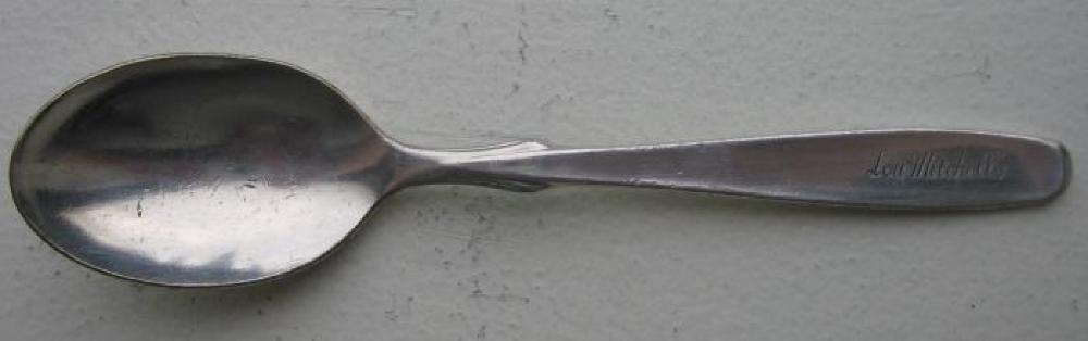 A silver spoon with he words "Lou Mitchell's" engraved on the handle.