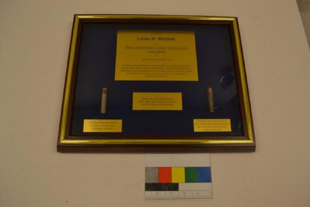An award from the United Hellenic American Congress to Louis Mitchell contains soil from Athens and soil from under the US Capitol Building in DC "A leader and philanthropist who exemplifies governmental ideals of both Greece and the US."