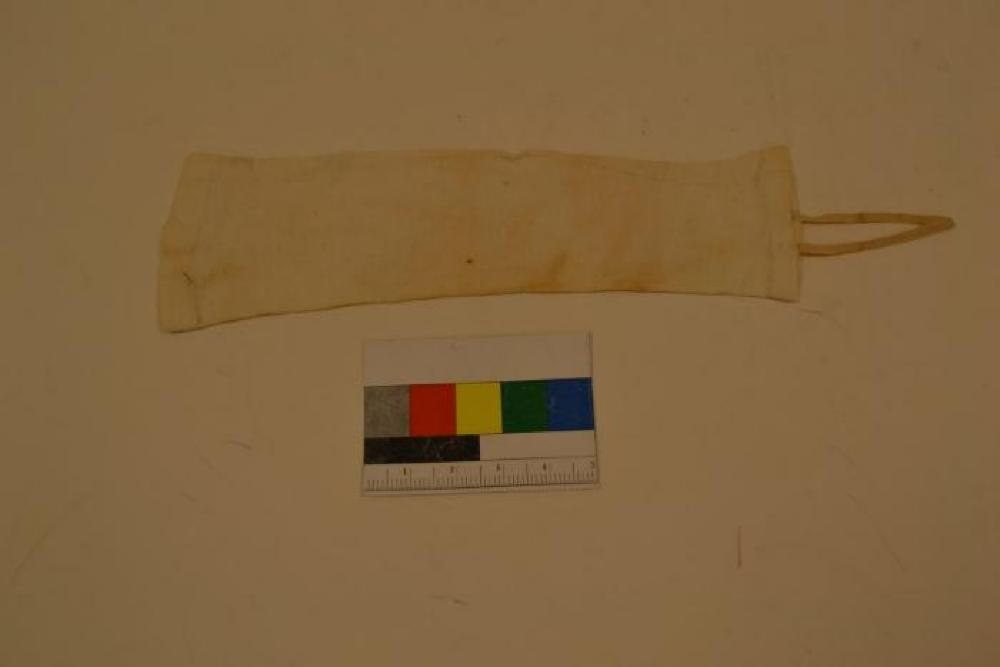 White, cotton leg warmer with very heavy staning. The staning is a fairly uniform throughout. An elastic band is attached to the bottom and is staned as well.