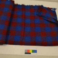A fringed woolen beadspread. This textile is a large plaid print in blue and red and is very thick.