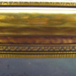 This is a colored oil portrait depicting a Cretan man in profile. The background is plain, painted in mottled shades of gray. The area immediately around the man's face is much lighter and accentuated by muted shades of various lighter colors. He is visible only from the chest up. The man appears to be middle-aged with dark brown or black hair and eyes and weathered skin. He sports a beard which is medium length, salt and pepper in color, and neatly trimmed. He is wearing a dark gray cap of some kind, a gray-green collared shirt with thin dark blue stripes, a dark blue vest and has a red bag slung over his right shoulder. The painting is set in a frame finished in varying shades of gold and copper.