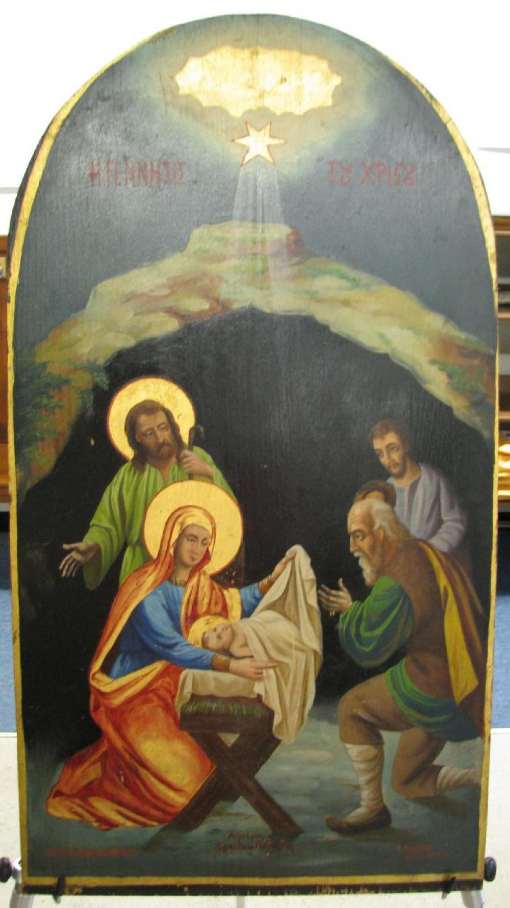 This is a colored painting on a wooden tablet. The painting depicts a scene of the Virgin Mary and Joseph gazing down at their infant child, accompanied by two others. Above them are clouds and a golden star shining down on them. On both sides of the star is Greek writing. There is a hanging wire attached to the back of the wooden tablet.