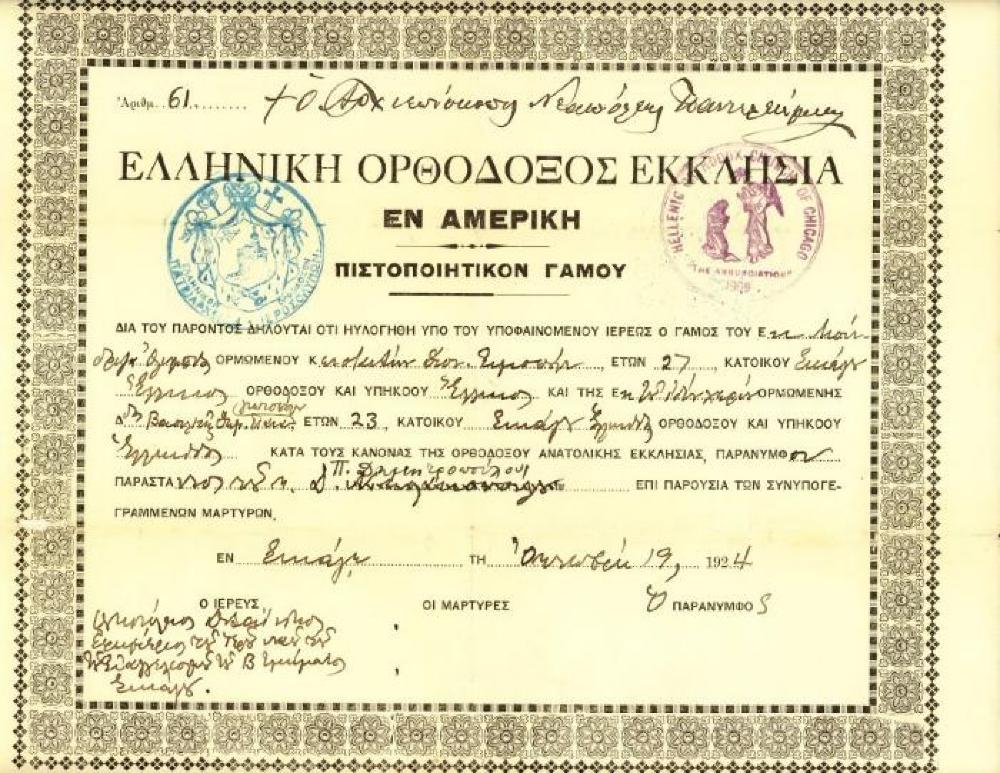Certificate, Marriage, October 19, 1924, National Hellenic Museum, https://collections.nationalhellenicmuseum.org/Detail/objects/7944. Accessed 11/25/25.