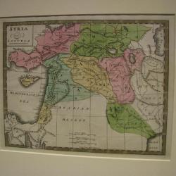 This is a small map of a portion of the Mediterranean Sea and the regions to the immediate East. In the top left hand corner of the map, "Syria and Assyria" is written. Around the map is a yellow boarder with black stripes. The text of the map is written in English. The areas of significant importance are indicated with color, pink, yellow, green, and blue. A few of the regions labeled are: the Arabian Desert, Syria, Babylonia, Armenia, Asia Minor and Mesopotamia. The map is in a wooden frame, matted on a cream background. The back of the frame has certificates of authenticity attached in addition to a hanging wire. The front of the map is covered in glass.