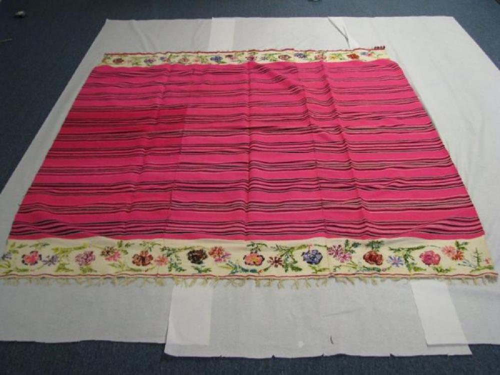 Large pink blanket with black stripes. There are 5 black stripes with 2 in between a set of 11 stripes total. 2 ends have fringe followed by 2 black stripes followed by white areas with embroidered flowers. The flowers are multi-colored on a green vine. Made in 3 loom sections and sewed together.