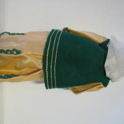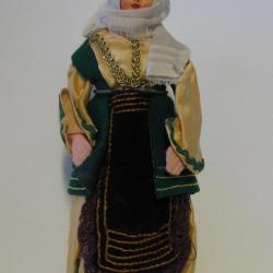 Female doll; fabric hands/face, machine painted facial features; brown fuzz hair; ivory linen headscarf w/ gold coin detail on forehead; green felt long vest w/ yellow thread stripe detail at bottom; butterscotch long sleeved, floor length silk dress w/ gold rope detail at bust, green snake ribbon cuff/skirt bottom detail; dark purple rectangular velvet apron w/ gold thread detail and purple fringe all around; white lace trimmed bloomers; pink/purple silk slip; black leather ankle shoes