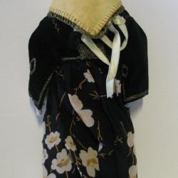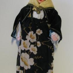 Female doll; fabric hands/face, machine painted facial features; black fuzz hair in 2 braids in back tied w/ yellow ribbon; yellow headscarf (bandana style)attached corners under chin with gold plastic "compass" decoration/bead, woven loop border all around; black velvet, long split sleeve jacket w/ silk light blue inside lining, gold thread trim and details; black fabric w/ large white floral pattern, open box shaped bust, ankle length dress; white linen undershirt w/ lace closure/cuffs; white w/ lace trim bloomers and slip; black leather ankle shoes w/ laces