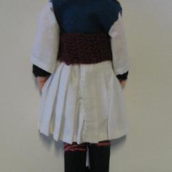 Male doll; fabric hands/face, machine painted facial features; black fuzz hair (short); black felt cap (no tassel); pink/blue/white stripe/box patterned stole/neck scarf w/ frayed ends; blue closed felt vest w/ blue felt buttons; wide maroon yarn crocheted waist belt/sash w/ tasseled ends; gold metal chain attached at L shoulder, drops below waist, tucks up into waist sash; white wide long sleeved undershirt; black woven arm cuffs/bracelets worn under shirt sleeves; white pleated knee length kilt; black stockings; coral/green (x2) knee bands on both legs; light tan leather shoes w/ black yarn tassels/poufs