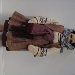 Female doll; fabric hands/face, hand painted facial features, embroidered eye-lashes; black yarn halo braid hair; white w/ blue floral pattern headscarf; off white (slight staining) no collar, long sleeved mid calf length dress w/ maroon thread neck detail, ½" wide skirt border w/ "rook" detail, maroon/blue/pink/yellow cuff detail; matching brown vest & high waist, knee length skirt (red thread border on vest, yellow/pink/blue horizontal lines on skirt); large maroon waist sash w/ end fringe; white lace trim bloomers; tan felt mid calf high boots