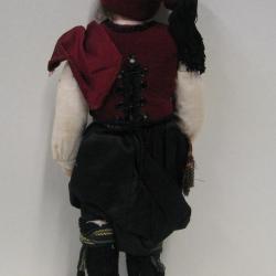 Male doll; fabric hands/face, hand painted facial features, embroidered eye-lashes; brown wire-like material hair (up); large maroon felt fez hat w/ black tassel, cocked to L; vest; front - dark blue velvet, square flap L over R closure w/ black ball tassel detail & red silk handkerchief/cape attached at closure and draped over R shoulder, back - red felt w/ black laces up middle, whole vest bordered w/ black rope thread all around; off white long-sleeved undershirt (slight staining); red/green/gold/cream/blue patterned fabric waist sash w/ frayed ends; black gaucho knickers; black lower leg wraps w/ yellow/blue detail ribbon around top w/ tassel ends in back; brown leather "snowshoe" style ankle shoes (L is almost entirely gone, very fragile)