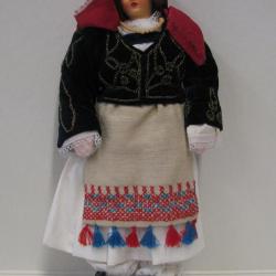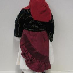 Female doll; fabric hands/face, machine painted facial features; brown fuzz hair in 2 back braids tied w/ pink ribbon; red silk triangular headscarf; plastic "pearl" necklace; dark blue velvet long-sleeved sewn closure jacket w/ gold thread embellishment on arms/bust/back, blue velvet "bust bridge" strip; white silk blouse w/ lace collar/closure/cuffs; yellow/brown rectangular apron w/ blue/red "x" stitch bottom detail & red/blue bottom tassels; white pleated mid-shin length skirt (large stain under apron); white linen genie pants under skirt (small stain under skirt's stain); dagger shaped maroon back skirt/tail w/ ruffled bottom; black felt ankle shoes w/ pleather laces.