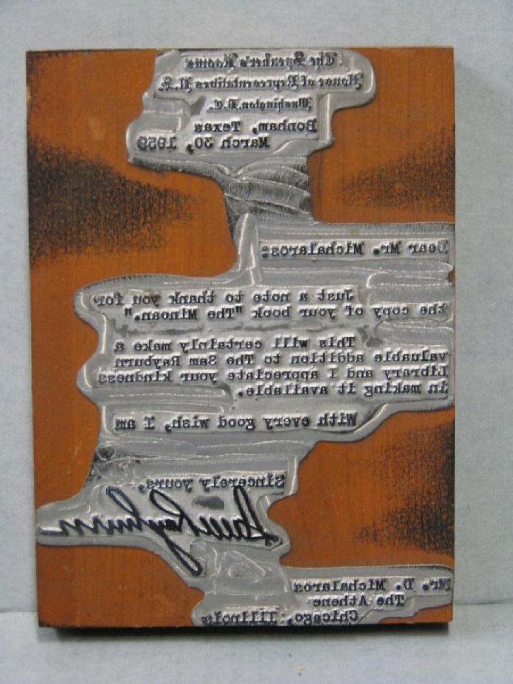Letter - sent to Mr. Michalaros from a Sam Rayburn thanking him for a copy of his book "The Minoan"