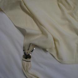 Ecru handmade fabric scarf. Hand sewn seams and hames. Embroidered detailing at corner with long cotton fringe. 1926 50 and 20 lepta coins and 1 turkish kurush(?) coin.