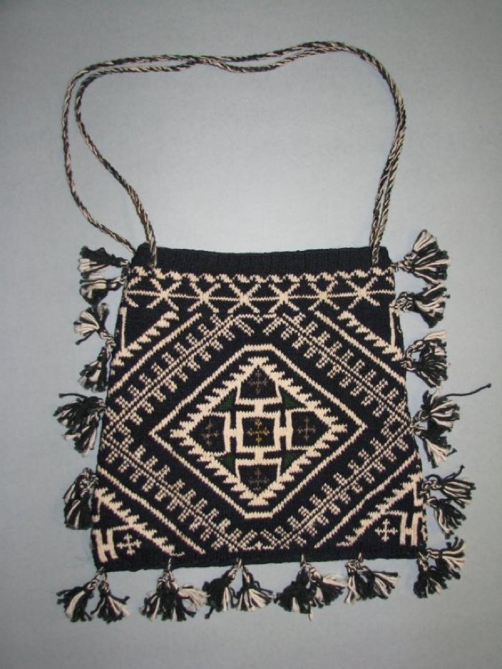 This style of purse came from the Sarakatsani people. Sarakatsani are indigenous people from Greek. They are nomatic people who live half the year in the mountains. Their art (song, pottery, dance, clothing design) resembles the geometric art of pre-classical Greece. Furthermore, Sarakatsani still practice traditional folk medicine. They are Greek Orthodox Christians and associate with Church of Greece. They begin their migration up the mountains on Saint George Day in April and return to the low plains on Saint Demetrius in October. Sarakatsanies have lived in countries surrounding Greece (Bulgaria, Albania, Republic of Macedonia). However, now there are only measurable numbers of people in Greece and Bulgaria. For women's outfits there are thirteen parts. Most items are made from hand-wooven wool.