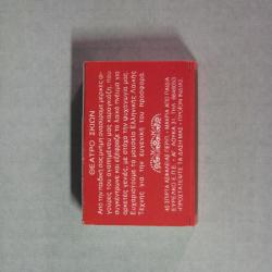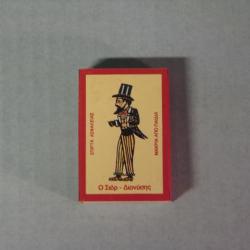 A matchbox with red border and light-yellow background, with a depiction of a male karaghiozi figure wearing yellow black striped pants, a coat with split tail, and a top hat. Figure is facing to the left.