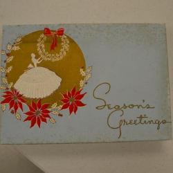 A middle-sized candy box that has "Season's Greetings" written across it's front in gold. It's front is mostly light blue with a golden circle in the upper left corner. This circle is wrapped with mistletoe and inside it is an image of a woman hanging a wreath. The woman and her dress are white with blue details. Some staining (possibly from mold) has speckled the corners of the box. The bottom of the box is white.