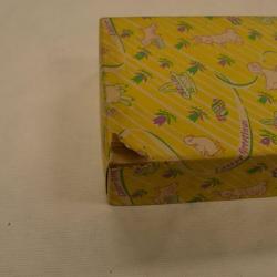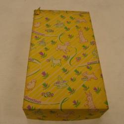 A medium candy box. This item is a yellow, Easter-themed box covered with rabbits, lambs, chicks, and Easter eggs. Also, the phrase "Easter Greetings" is repeated various times across the box. There are green and purple flowers, as well as easter baskets with eggs in them.
