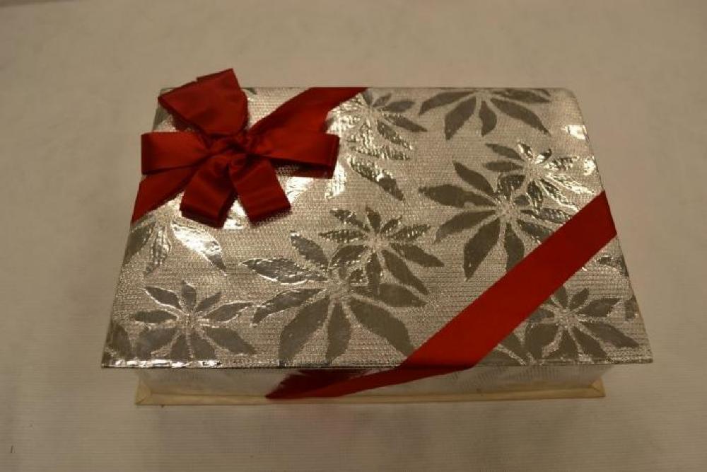A large, silvery candy box with a long red bow. There are silhouettes of mistletoes embossed onto the paper. The base of the box is white. The mistletoe design consists of a big mistletoe followed by a smaller mistletoe. Inside, the box is lined with cream colored paper.
