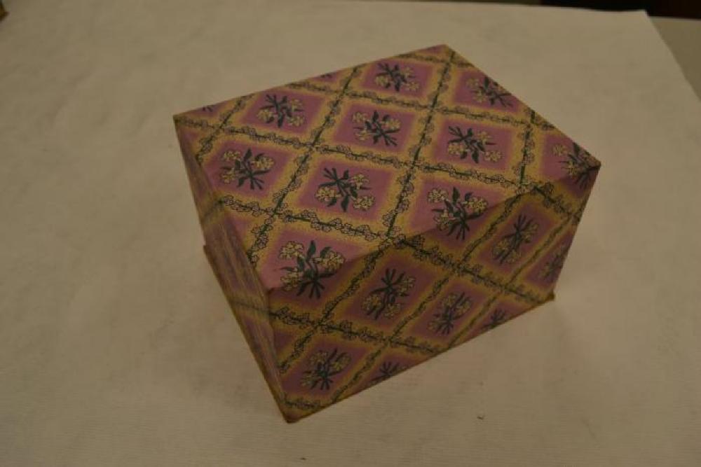 A small, Easter-themed candy box. The exterior is pink and covered in a crisscrossing pattern of flowers. The crisscrossibg pattern is outlined in white lines with green in the middle. the flowers are white with purple centers and are outlined in dark blue. There are also flowers in the diamonds in between the pattern. There are three flowers with green stems and leaves. The flowers are white. The bottom of the box is also white.