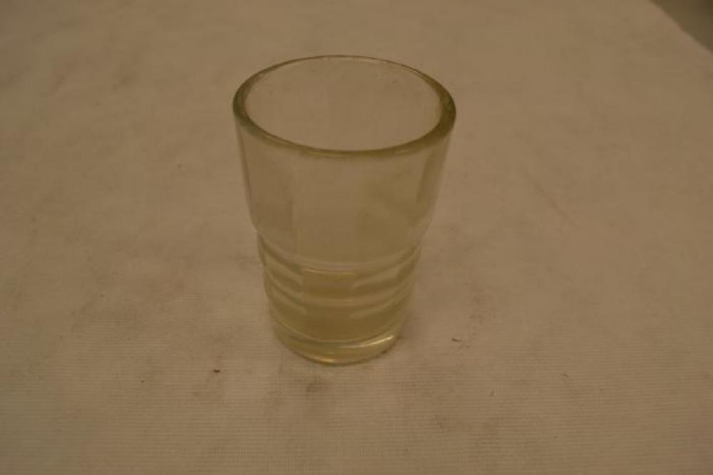 A small, though thick, clear unmarked glass. Has vertical striations and is "ribbed" down its lower half.