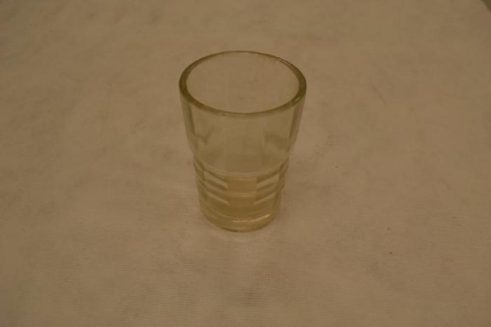 A small, though thick, unmarked glass. Has vertical striations and is "ribbed" down its lower half.