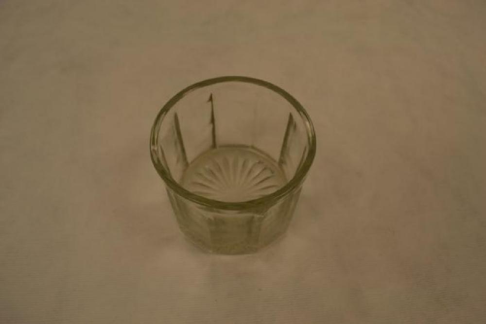 A plain, clear glass bowl. The bowl's sides are polygonal with vertical striations and the bottom has striations originating in the center and working outwards towards the edges. The striations on the sides are rounded at the top.