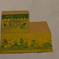 Small, cardboard candy box with yellow and green illustrations along the sides and "Happy Easter" on the top. Illustrations include rabbits, geese, flowers and easter eggs.