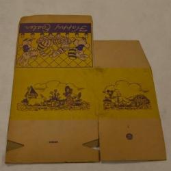 Large, cardboard candy box with yellow and purple illustrations along the sides and "Happy Easter" on the top. Illustrations include rabbits, geese, flowers and easter eggs.