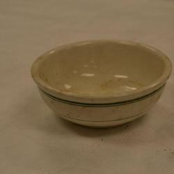 This medium sized, white ceramic bowl is plain white except for three green lines on the outer side of the bowl. Two of them are directly beneath the lip of the bowl and wrap around the entire thing. The top line is thicker than the lower one, the lower one being about the width of a line drawn by a pen or pencil. The third line is lower on the bowl, at the point where it curves toward the base. This decoration is the same width as the lower one in the upper grouping. The entire bowl is completely smooth and has a glass like sheen which makes it shiny. On the lip of the very bottom it is darker and more worn due to use. There are also slight discolorations in different areas spread out on the exterior. On the very base of the bowl is printed the company's name who makes it. Inside of a ribbon design is the word "Sterling" and below the ribbon says "Vitrified China" in a cursive font. Direcltly below those words is the location of "East Liverpool, Ohio U.S.A" in a standard font.