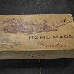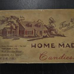 A rectangular candy box from the Ting-a-Ling candy store in Chicago. The box is rectangular in size, and has a brown patina to it. The front face of the box depicts a two-story New England style house with tries, and the lettering "Ting-a-Ling" in the top right corner. The words "Home Made Candies" also appear in the bottom right section, and the candy store's address appears in the bottom right section of the front face. The reverse face of the box is blank.