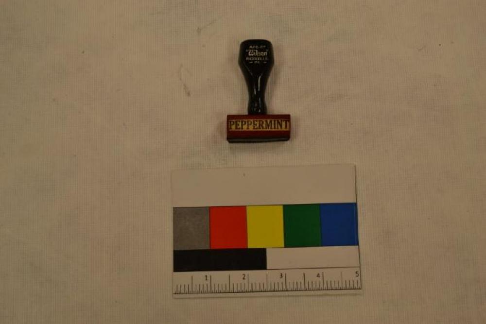 A single custome made hand-held rubber stamp for the Ting-a-Ling candy shop. Handle is of black wood and has the wording "Mfg. by 'Wilson' Brookville, PA" imprinted on it. Stamp imprint creates wording stating: "Peppermint"