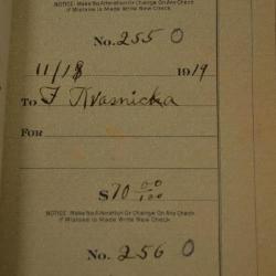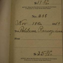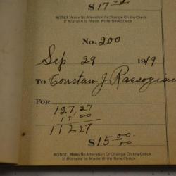 This is a book of check receipts from 1919/1920. The book is bound in a thick black cardboard material, with a red/brown binding. Almost every page is written on. Checks of particular interest: Check #200 was a check sent to the donor's father while he was away in Greece during WWI. It was writtten to Constan. J. Rassogianis on Sept. 29, 1919 for $15.00. Check #238 was a check sent to John's wife in Greece before she came to America. It was written to Paleteme Rassogianis on November 18, 1919 for $25.00. Check #255 was written on November 18, 1919 to a "F. Kvasnika," who may have been the owner of the St. Louis store property for the amount of $70.00.