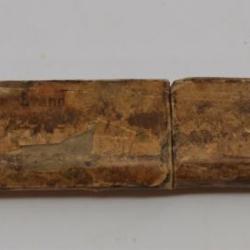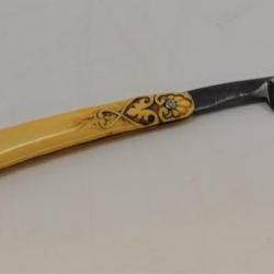 This is a straight-edge razor in a sheath. The razor folds into a plastic yellow handle peice, with intricate detailed carved into the surface. On the blade it says, "J. Wiss & Sons Newark, NJ." The razor is placed in a cardboard sheath, with is then placed into a two part additional sheath. Most of the lettering has been worn or peeled off, but it reads "Lion Brand."