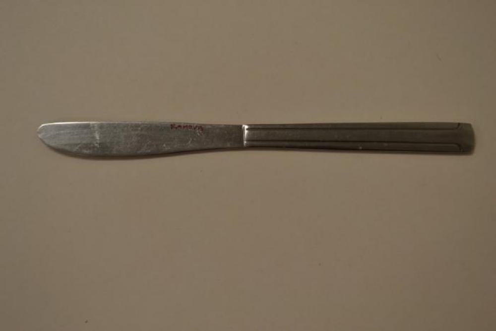 A metal butter knife with writing on the blade in red marker that says, "Ramova." The handle has a simple design of two lines going from the blade towards the end and less than a centimeter from the end of the handle the curve off, one to each side. This design is on both sides of the handle. The blade is smooth on the side with writing and on the other side it has very small teeth. The knife has some stains and residue along both sides of the knife.