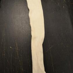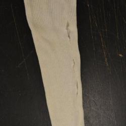 A ribbed white stocking made out of cottom with a white elastic band at the bottom. The top is slightly wider than the bottom.