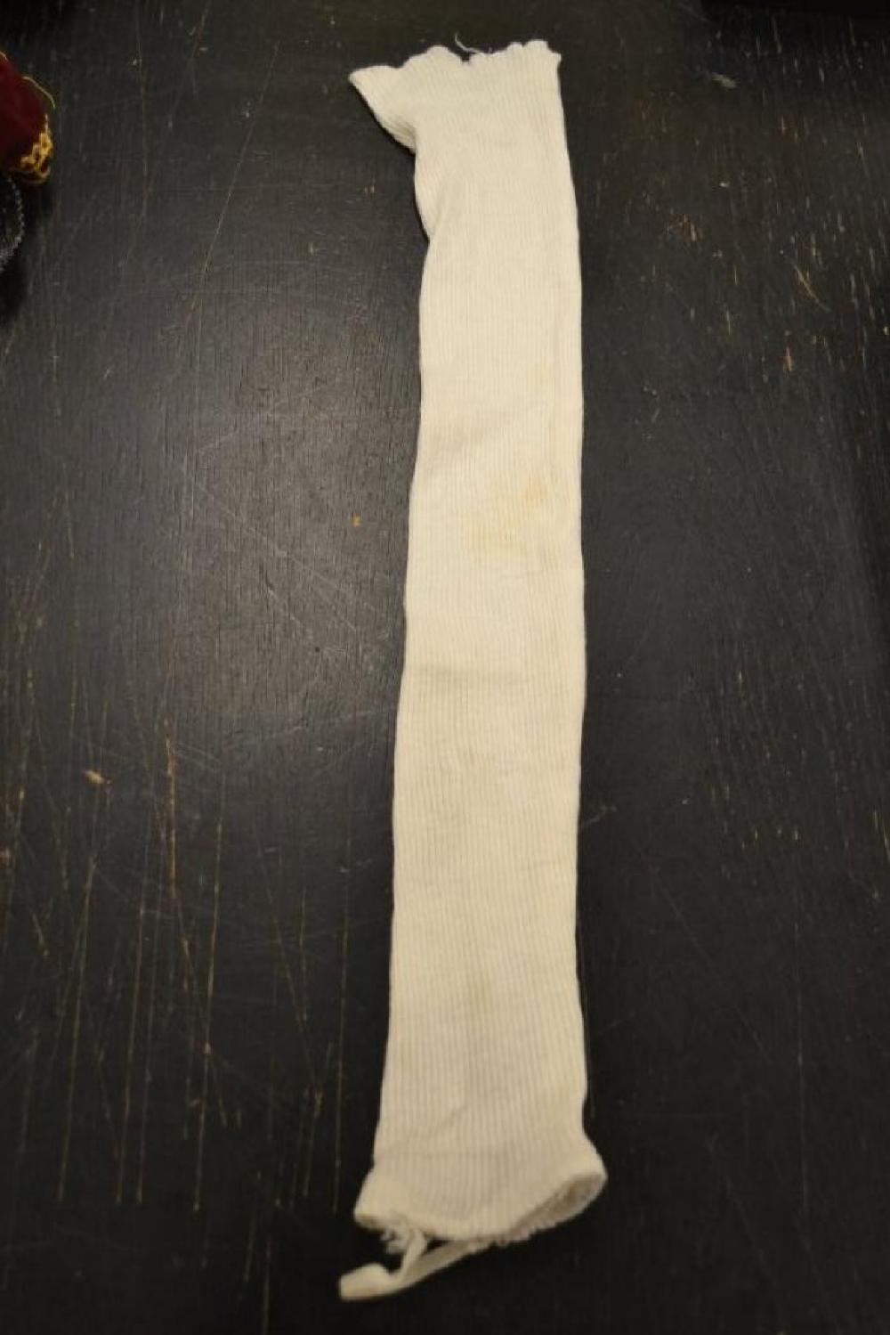 A ribbed white stocking made out of cottom with a white elastic band at the bottom. The top is slightly wider than the bottom.