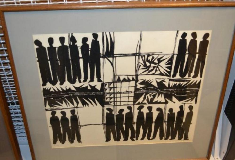 A black and white woodblock print made by Hambis Tsangaris in 1973-1980. In the top left corner there are six people standing, in the bottom left there are three, in the top right there are three, and on the bottom middle to right side there are nine people. There is barbed wire going through the middle of the painting horizontally. There are black lines making several squared sections throughout the print. In the middle is a square section with several lines making it look like a window. In the print there are some designs that are more elaborate than the lined designs.