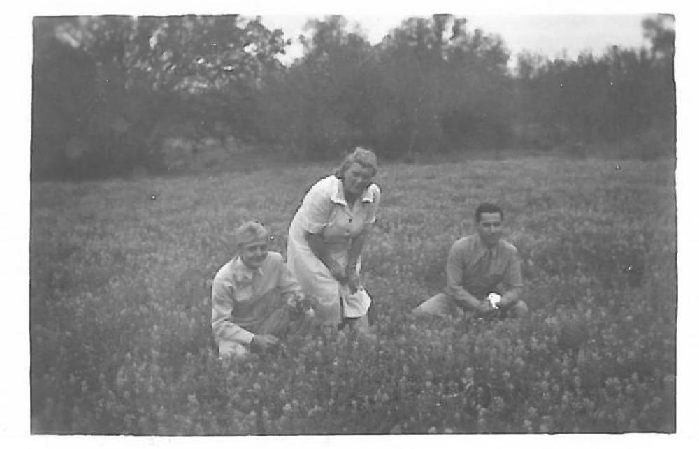 A black and white picture of two men and and a woman in a field. On the back it says, "Peter, myself, and Mike." The man on the left is sitting on the ground and wearing a long sleeve shirt, pants, and a hat. The woman is in the middle wearing a long button up dress and is bendings over. The other man is sitting on the ground and wearing pants and a long sleeve shirt. They are in a field of some plants and there are trees in the back.