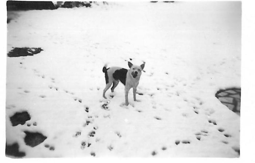A black and white picture of a black and white dog outside in the snow. On the back it says, "Butch says hello in the snow." There are a lot of dog paw prints in the snow.